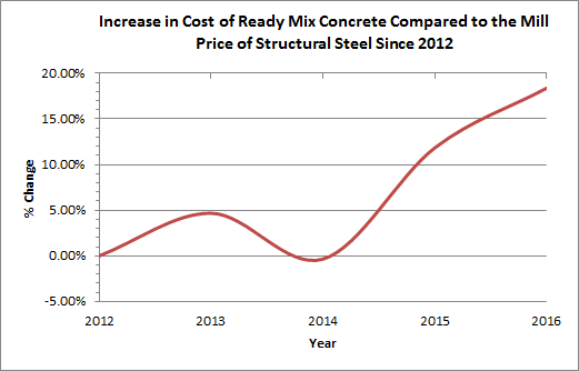 Fluctuation in raw material costs in recent years has made steel even more attractive from an economic standpoint. Since 2012, the cost of ready-mix concrete has increased more than 18% relative to the cost of hot-rolled steel from the mill (see Figure 2 below).