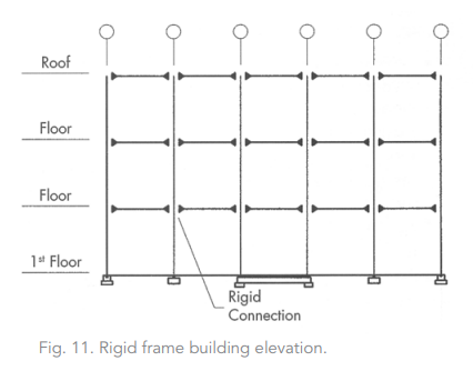 Rigid frames, or moment frames, are used when the architectural design or some other constraint does not allow for diagonally braced frames. This type of lateral resisting system incorporates rigid welded or bolted connections between the columns and the beams/girders. Rigid frames are generally more expensive and less efficient at resisting lateral loads than a braced-frame system. However, low-rise building spans frequently use rigid frames when the bays can't accommodate diagonal braces.