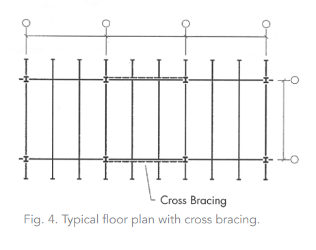 The cross-brace frame, represented in Figures 4 and 5, is perhaps the most commonly used system. Figure 4 shows a typical floor framing plan with cross bracing denoted by the dashed-line drawn between two center columns. The solid lines indicate the floor beams and girders.