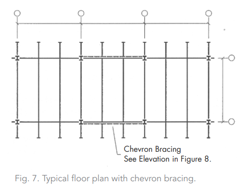 Figure 7 shows a typical floor framing plan with the bays using chevron bracing, as denoted by the dashed-line drawn from between the two center columns. The solid lines indicate the floor beams and girders. Figure 8 shows a typical multi-floor building elevation using chevron bracing.
