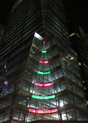 Photo at right: NYC’s 7 Bryant Park -- a 28-story, steel-framed office tower -- lights up for the holidays.