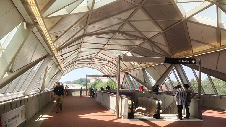 Nearly four decades after the first Metro lines began operating in 1976, the first phase of the $6.8 billion Silver Line extension opened this past summer. The new line is nearly 30 miles long, including the portion where it runs parallel to the Orange and Blue Lines. Phase 1 adds an 11.6-mile-route from where the Silver Line splits from the Orange Line and includes five new stations. Crystal Steel in Delmar, Del. (an AISC Member and AISC Certified Fabricator) fabricated approximately 3,200 tons for this phase. Phase 2, currently under construction, is scheduled to open in 2018 and will expand the line another 11.5 miles to Dulles and add six more stations.