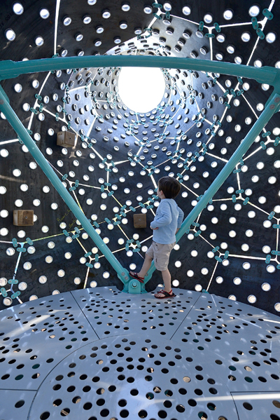 The Gourd is built out of 70 plates of 12-gauge weathering steel wrapped around a robin’s egg blue internal octahedral structure and perforated with over 1,000 Ball Mason jars. The jars illuminate the interior space while providing a visible connection to the outside world.