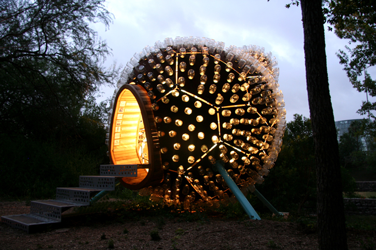 Rather than pursuing a form that resembles a small human house - as is typically seen in most birdhouses (human-scale or otherwise) - the design team chose a form inspired by the bottle gourd, first used in its hollowed-out form by Native Americans to attract Purple Martins as a nesting spot. The organic form, designed by Overland Partners Architects and Datum Engineers, inspires creativity and imagination while pushing the limits of digital design and fabrication.