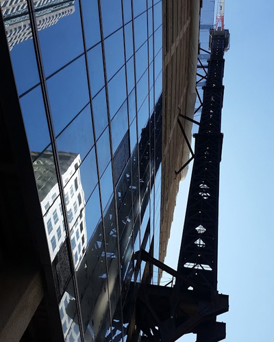 A cantilevered crane moves along the tower’s glass façade.