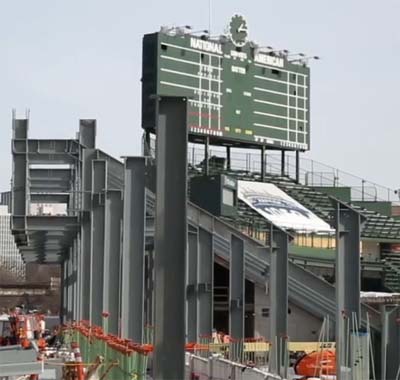 (Photo at right: Steel beams installed in the left bleachers at Wrigley Field earlier this year.)