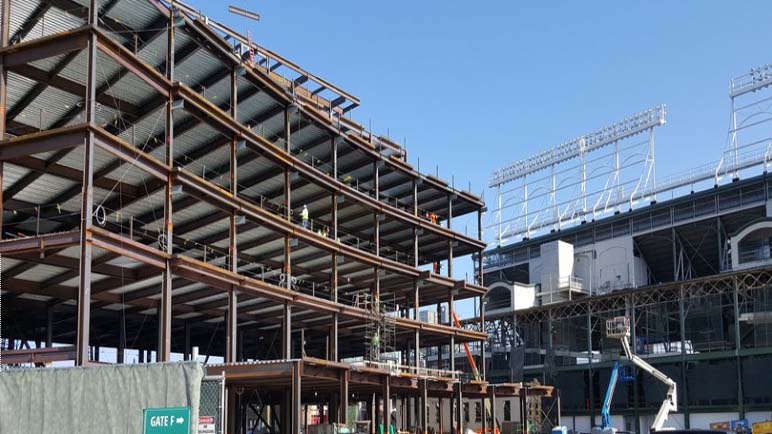 Work is progressing on the 1060 Project — the expansion and restoration of Chicago’s historic Wrigley Field. Steel framing is taking shape for the new, six-story Triangle Building adjacent to the ballpark. Once completed, the building will house the Cubs' new clubhouse and offices, as well as an open-air plaza and retail space.
