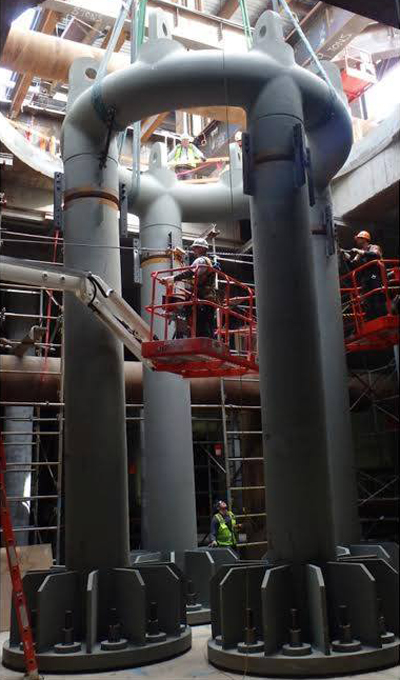 The Light Column is assembled of tubular steel columns and 56 cast steel nodes with various geometries, supplied by Cast Connex (an AISC Member). Each vertical segment of the structure is topped off with a uniquely designed horizontal ring, made up of roller or induction bent pipe segments, except for the top and bottom rings, with the smallest ring weighing in at approximately 100,000 pounds. As the structure grows taller, the rings become wider and thinner, expanding the capacity for natural light to enter the building.