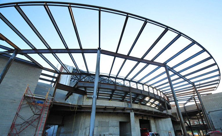 The towering radial curtain wall wrapping much of the exterior is laterally supported by exposed curved HSS8×8×5 ∕16 girts. In the main lobby, the curtain wall is canted outward 10°, creating a space between these columns and the glazing, which is filled with sections of HSS rolled in the shape of, yes, a musical note.