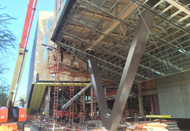 Approximately 1,750 tons of structural steel in the form of approximately 3,000 members is used above grade. The structural steel design features suspended outdoor pedestrian bridges linking the building across the “canyon,” a sloped exterior V-column supporting five stories above and a roof diaphragm truss to support a fabric canopy shading system over the courtyard.