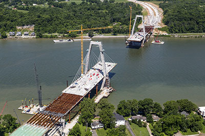 Recent drone and aerial footage shows the progress being made for the East End Crossing of the Ohio River Bridges Project between Kentucky and Indiana. Workers are installing the structural steel for the main span of the 2,500-ft-long, cable-stayed bridge, which will connect Louisville with Utica, Ind., over the Ohio River. The project, which uses about 6,700 tons of structural steel, is roughly 80% complete and will open to traffic late this year. The bridge will include two lanes in each direction and a 13-ft-wide pedestrian and bicycle path.