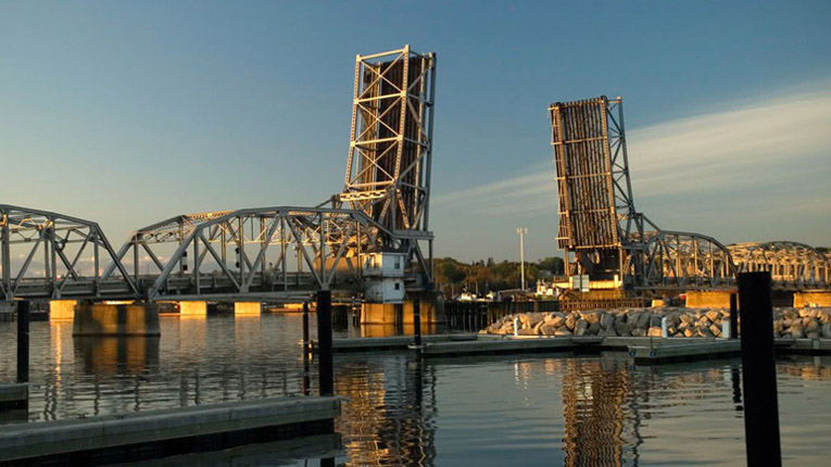 This 1,420-ft landmark bridge spans the Sturgeon Bay Ship Canal, connecting Wisconsin Highway 57 to the central business district of Sturgeon Bay in scenic Door County. It is also recognized for its engineering and design, primarily for its unique upper bascule section. The bridge is comprised of a double-leaf, rolling-lift moveable span and 12 steel truss approach spans.