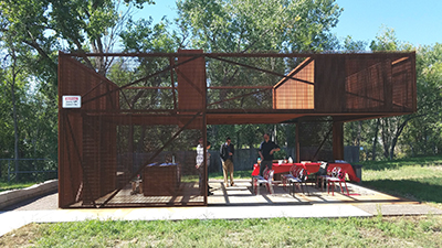 The mission of this outdoor classroom structure is to educate residents of the nearby transit-oriented development about urban farming, while simultaneously providing space for environmental education and other youth programs. The project brief required the structure to have an opaque wall preserving the privacy of the classroom near the path leading to the light rail line, which was achieved with vertically oriented steel bar grate cladding. In this case the skin is structural, providing dynamic transparency as well as support for the majority of the structure’s gravity loads.