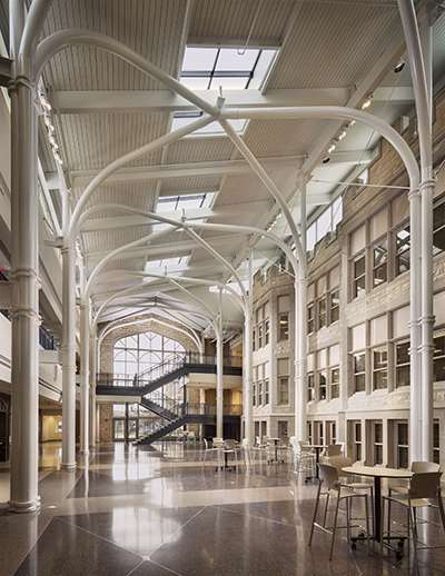 The design team envisioned a space that would serve as the heart of the school, connecting the new with the old. The new atrium references elements of this landmark building’s original style but interprets it in a modern way that takes advantage of structural steel to create a wide-open, bright, airy space. The design, which required approval from the state government due to the building’s historic designation, incorporates a limestone wall of the existing school, treating it as artwork on the interior of the new structure.