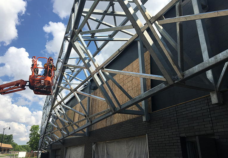 Steel, glass and brick formed the palette the design team used to bring the school’s vision to life: a building designed functionally and materially to represent the three primary art instruction areas of metalworking (steel framing), ceramics (brick façade) and glassblowing (glass curtain wall). The interplay of these elements carries throughout the structure, and structural steel (110 tons in all), with its strength, lightness, durability, adaptability and variety made it the only material to fulfill the requirements for both the internal structural skeleton and external embellishments. Kully Pipe and Steel Supply, Inc., Hastings, Neb. (an AISC member and certified fabricator) was the project’s steel fabricator and detailer.