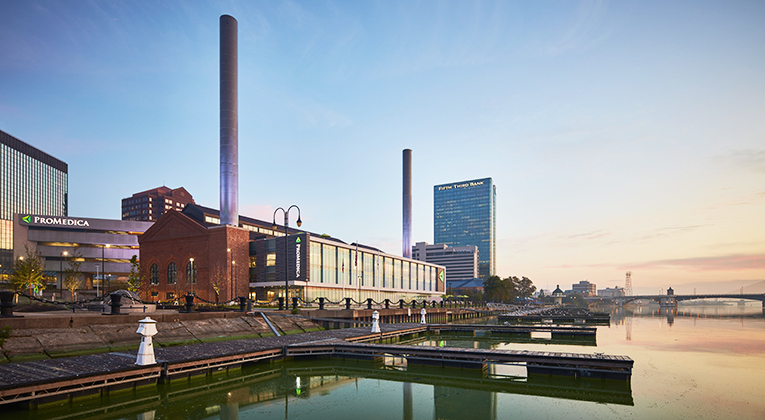 The team revived a late 19th century historic Daniel Burnham-designed steam plant and a brutalist bank building using structural steel, which mostly remained exposed. Due to campus’ location on the Maumee River and next to Promenade Park, ProMedica’s Corporate Headquarters is helping in the transformation of the riverfront with its elevated architecture.