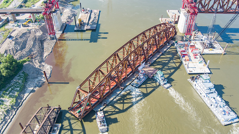 To ensure minimal disruptions to rail service during construction, the project team constructed all three new spans for the bridge at AISC member fabricator Veritas Steel in Wisconsin and shipped them to St. Louis for final assembly. Immediately after floating the old spans out, workers floated in the new spans, with the final truss installed on August 27.