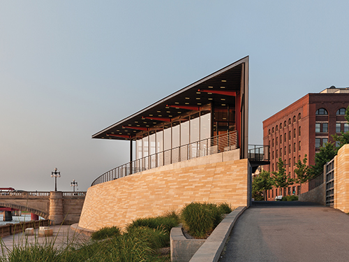 The pavilion is one piece in a plan to encourage Des Moines residents and visitors to take advantage of the Iowa capital’s scenic riverfront. Situated next to a new recreational trail and waterfront and riverfront promenades at the west end of the historic Court Avenue Bridge, the triangular 2,200-sq.-ft pavilion was designed to mimic the prow of a boat. The angular space is clad with a folded black zinc skin and roof, and the west façade is louvered to allow for views upriver to the north while blocking the harsh, western sun. To accomplish this visual effect, an exposed steel frame was used to support the zinc skin, and steel tube sections are concealed within the skin itself. This structure discretely accommodates the multiple cantilevers and reduces the apparent thickness of this folded plane.