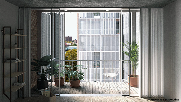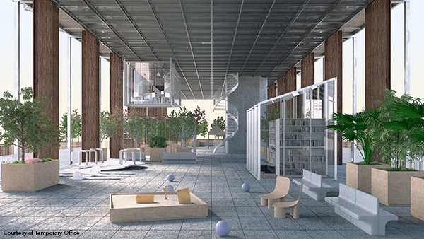 Public space is central to their plan to build community. Their design would open up the first floor of the existing building to create a porous space that welcomes residents and those from the surrounding areas. Even the corridors are designed to create a village-like atmosphere. The "Common Sky" area between the new and old units would serve as a focal point for people to gather, with a library and cafe. A roof terrace with modular steel trays provides space for an urban farm, as well.