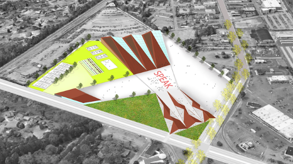 Mert Kansu and Yimeng Teng of VMDO Architects proposed a civic mixed-use plaza in Richmond, Va., that focuses on public engagement, community programs, and sustainability. Their design incorporates steel plates to create an expressive folding form.
