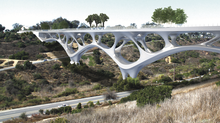 Hunter Ruthrauff of T.Y. Lin International Group in San Diego designed a 3D-printed steel pedestrian bridge that spans Balboa Park's Florida Canyon. Ruthrauff chose 3D-printed steel because it offers better tensile strength than 3D-printed concrete and lessens the complexity of the design process.