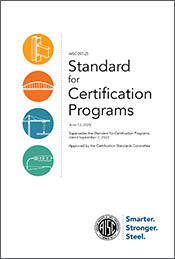 2025 Certification DocumentsThe 2025 edition of AISC 207 will continue as the primary reference for the AISC Certification program. It supersedes the 2023 edition and will take effect for current program participants and applicants for audits on or after February 1, 2026. The 2025 edition of AISC 420/SSPC-QP3 is published as a joint effort with the Association for Materials Protection and Performance (AMPP). It is approved by the Certification Standards Committee (AISC) and the Standards Committee on Accreditation Standards (AMPP). This refreshes a standard that was last published in 2010. It will be used for the certification program at AISC starting with audits on or after February 1, 2026. |
